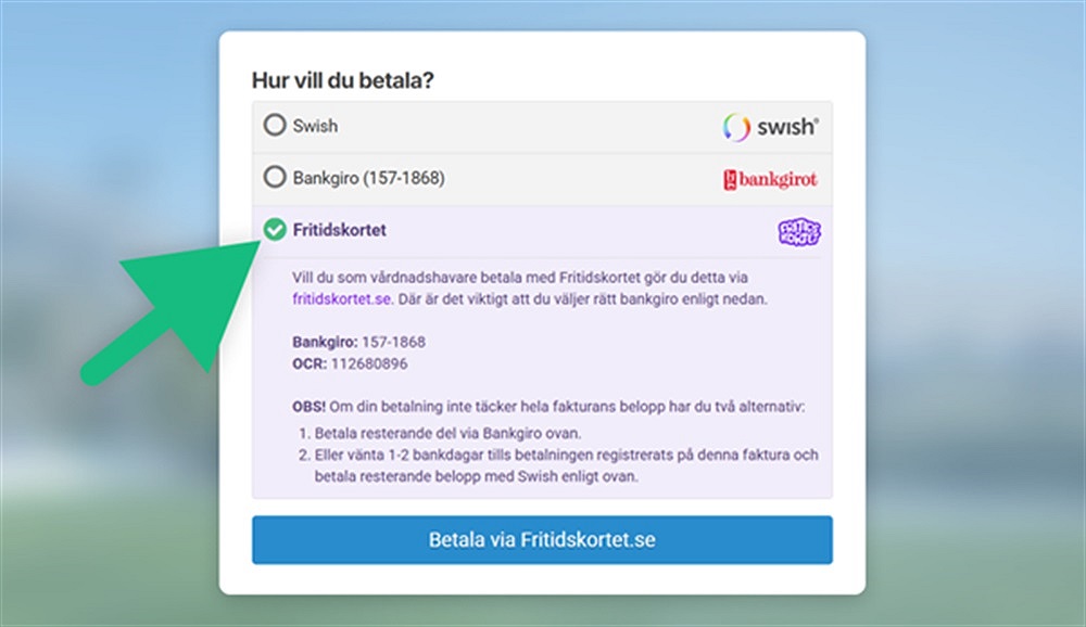 När fakturan för deltagaravgiften 2026 skickas ut från Visby Boll- och Idrottssällskap kommer Fritidskortet att finnas som ett betalsätt enligt bilden. - Så genomförs betalningen