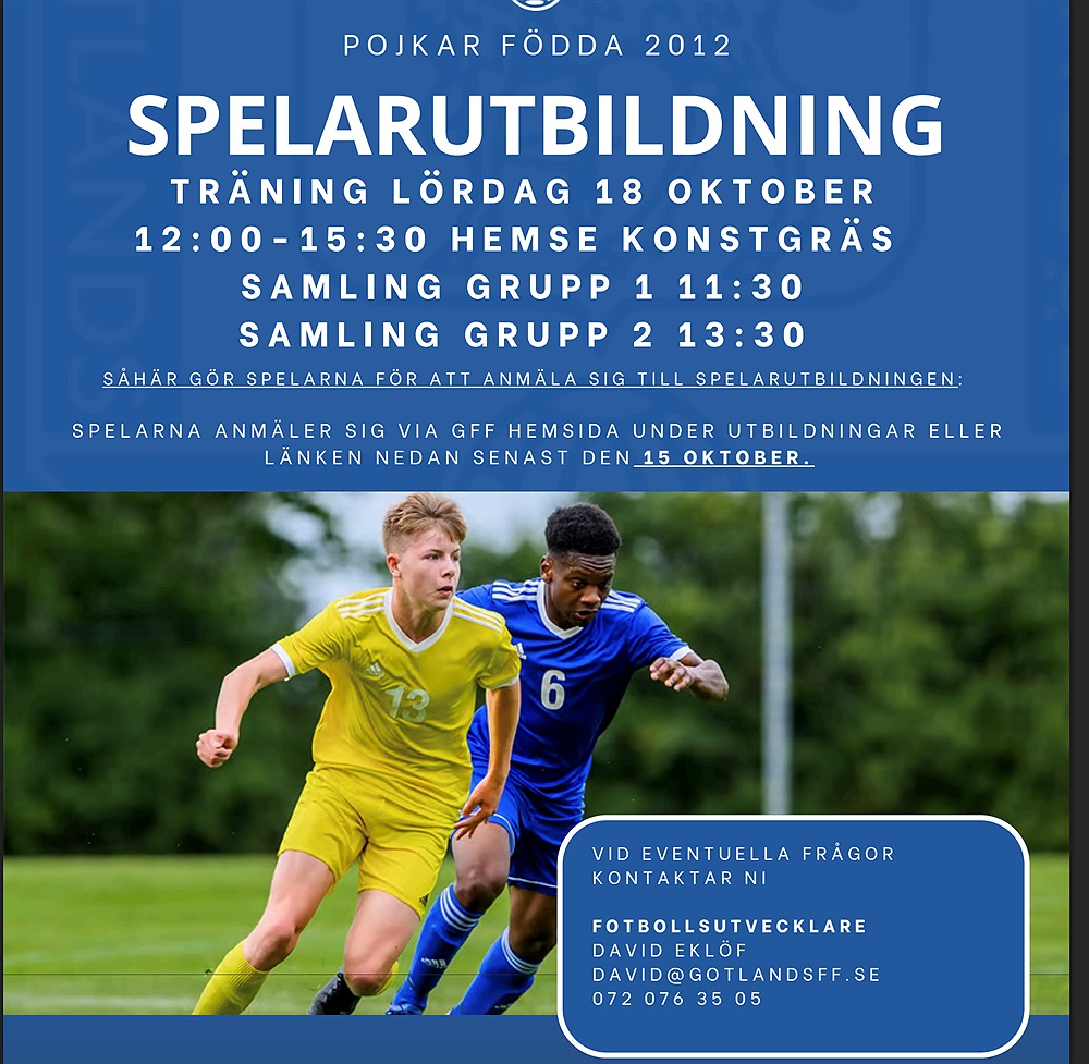 Hej, Nu är det dags för nästa tillfälle med Gotlands Fotbollsförbund för gruppen Pojkar Födda 2012 (13 år). Träningen genomförs lördag 18 oktober på Hemse Konstgräs.